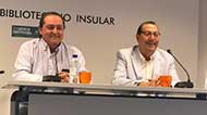 Descripcion de la foto: Momentos de la firma de este acuerdo de colaboración. De izq a drcha en ambas tomas Dr. Nicolás Díaz Chico (Vicepresidente de la Fundación ICIC), don Juan Manuel Suárez del Toro (Presidente de la Caja Insular de Ahorros de Canarias) y Dr. Pedro Lara Jiménez (Director del ICIC). Descargar foto 1, foto 2